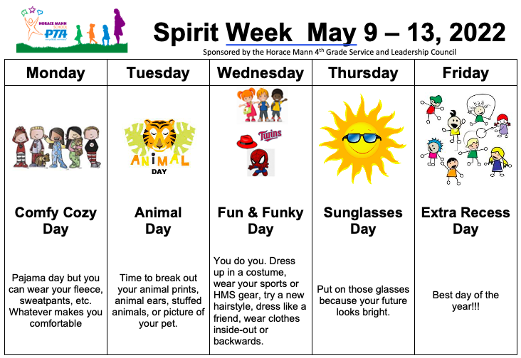 It is time to have some FUN! The HM 4th Grade Service and Leadership Council has planned a fun Spirit Week the week of May 9-13. Flier attached. The goal is to have all students and staff participate and show their HMS Spirit. The HMS PTA has purchased some fun things for the teachers to share-see more details below. Have FUN Horace Mann.